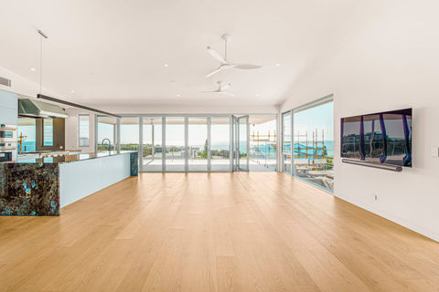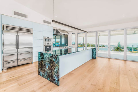 This 700m2 architectural home was designed by Adrian Ramsay at Adrian Ramsay Design House. The Point Arkwright home consists of 3 levels with an elevator to access each floor. The open plan living, and large aluminium windows provide lots of natural light and sweeping views of the beautiful coastline.