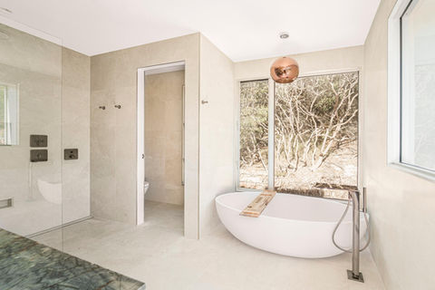 The built-in concrete pool on the top level overlooks the coast through a custom acrylic pool window, providing the ultimate place to spend the hot summer months.